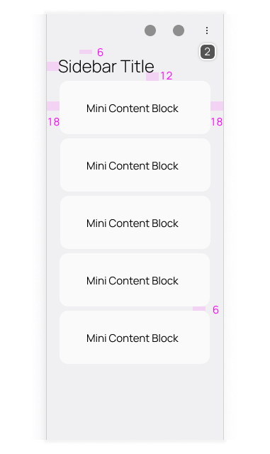• Elements below the Sidebar have 6dp spacing between them, irregardless if they're Items or Mini Content Blocks.
